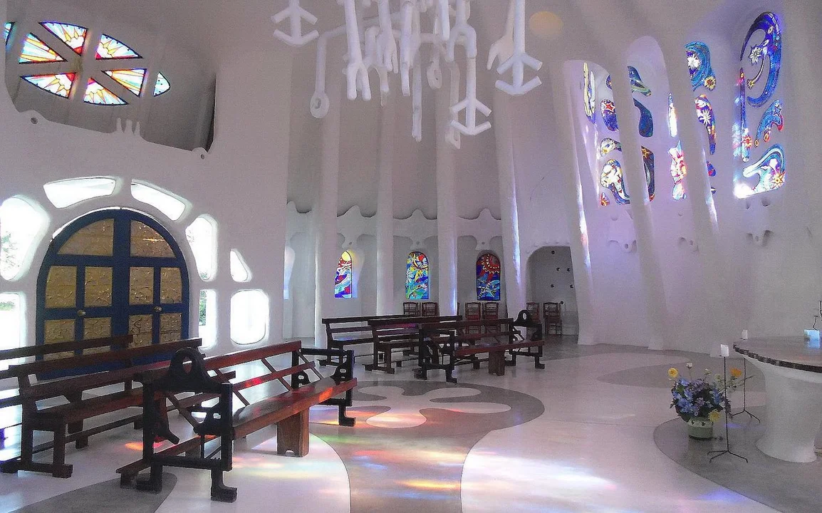 La construcción no tiene rectas, es todo curvas, y se destacan los vitrales, muy coloridos. Los diseñó inspirado en las cuatro estaciones del año, que representaban en sus diferentes fases a la vida, y también a la naturaleza y el universo.