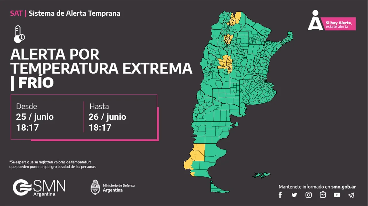 En otra jornada con diferentes alertas climáticas, el Servicio Meteorológico Nacional (SMN) mantenía para este miércoles nuevas advertencias por frío y bajas temperaturas extremas para zonas del norte, centro y sur del país.