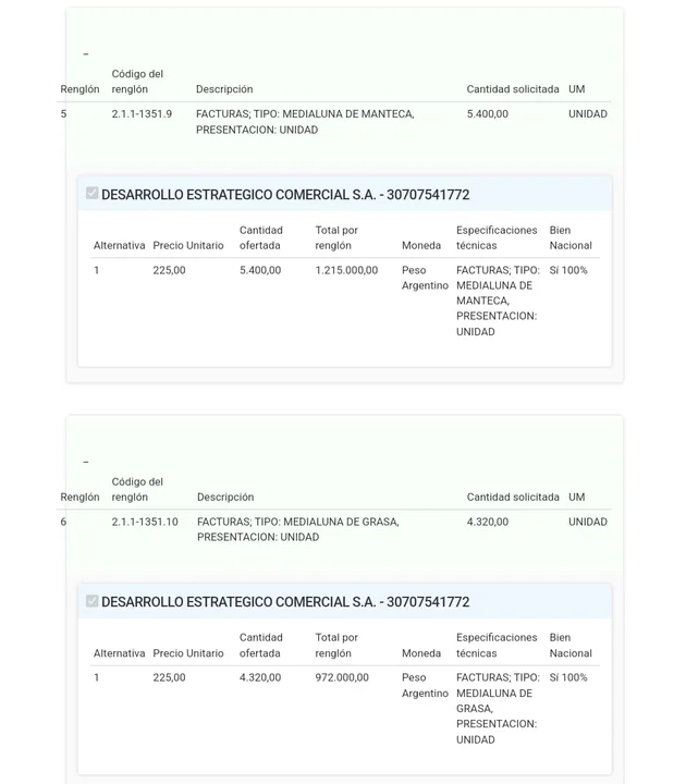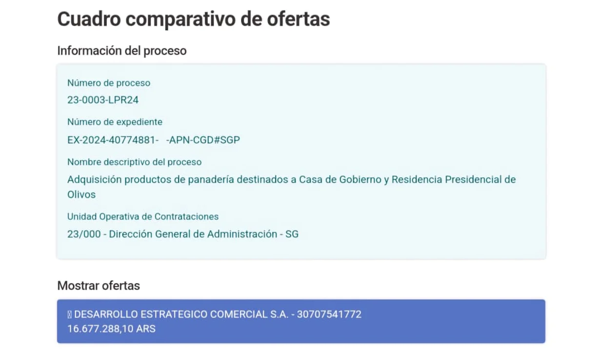 La adjudicación de la provisión de medialunas y panes la obtuvo la empresa Desarrollo Estratégico Comercial S.A., la misma que prestaba el servicio durante la administración de Alberto Fernández. En aquél entonces, la licitación fue fijada en un valor de $13.397.688.