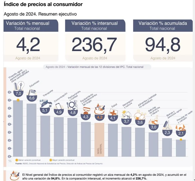 Pero también las tarifas encabezaron el índice de precios al consumidor y en agosto la división de mayor aumento fue Vivienda, agua, electricidad y otros combustibles (7,0%) debido a las alzas en Alquiler de la vivienda y gastos conexos, Suministro de agua y Electricidad, gas y otros combustibles.