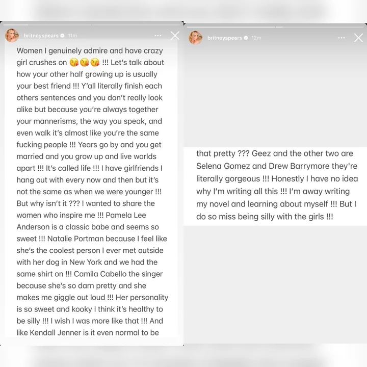 Spears comenzó sus publicaciones comentando sobre la influencia que tienen las amistades en el crecimiento personal. "Se copian los manerismos, la forma de hablar, hasta la forma en la que caminan", expresó, destacando la conexión especial que se forma entre amigas. Sin embargo, también lamentó cómo esas relaciones pueden desvanecerse con el tiempo: "Tengo amigas con las que salgo, pero no es lo mismo que cuando éramos jóvenes".