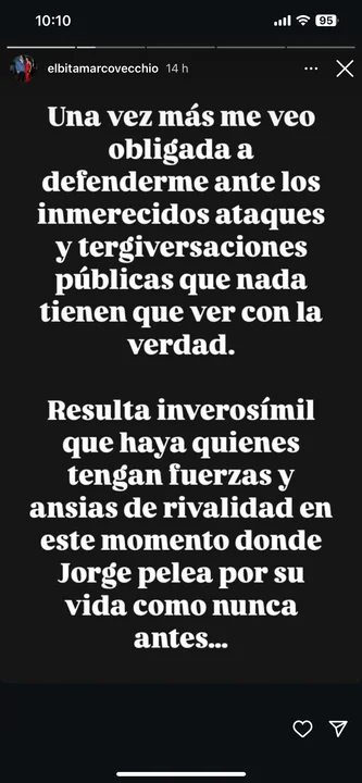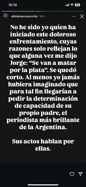 Desde su cuenta de Instagram, Marcovecchio continuó defendiendo su posición, manifestando que no ha sido ella quien ha iniciado este enfrentamiento. “Se van a matar por la plata”, citó a Lanata, sugiriendo que la disputa se centra en intereses económicos. En su conclusión, reiteró su compromiso de salvaguardar lo que Lanata le ha confiado, reafirmando su lealtad hacia él en este momento crítico de su salud.