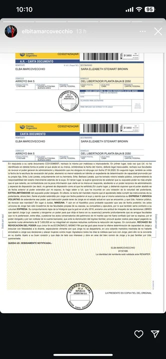 Ante estas afirmaciones, Marcovecchio no tardó en responder. En su comunicado, califica la carta de Brown como “maliciosa e improcedente”, argumentando que sus acciones demuestran una falta de respeto hacia las decisiones tomadas libremente por Jorge, incluido su matrimonio con ella y la delegación de poder para que ella administre sus asuntos en su ausencia.