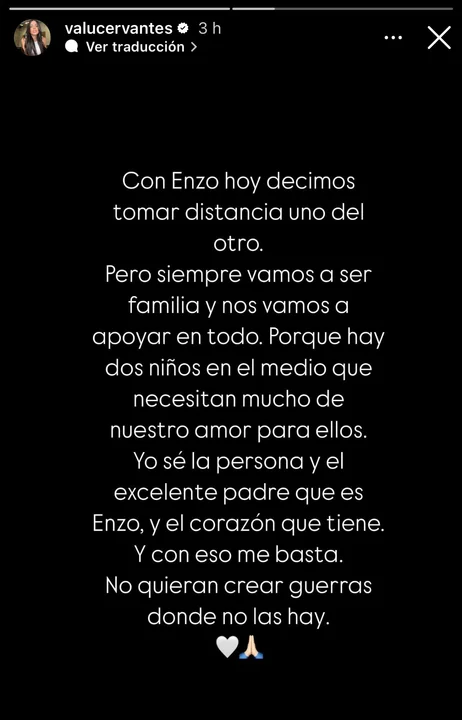 Cervantes utilizó sus redes sociales para comunicar su distanciamiento: “Con Enzo hoy decimos tomar distancia uno del otro. Pero siempre vamos a ser familia y nos vamos a apoyar en todo. Porque hay dos niños en el medio que necesitan mucho de nuestro amor para ellos”. En este sentido, la botinera desmintió especulaciones sobre la causa de la ruptura, subrayando la calidad del padre de Fernández: “Yo sé la persona y el excelente padre que es Enzo, y el corazón que tiene. Y con eso me basta. No quieran crear guerras donde no las hay”.