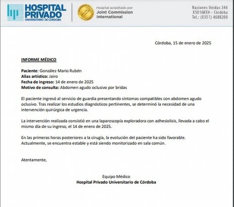 El parte médico que envió el Hospital Privado Universitario de Córdoba indicó que se encuentra estable y está siendo monitorizado en sala común. Si continúa evolucionando, el cantante recibiría el alta en las próximas 48 horas.