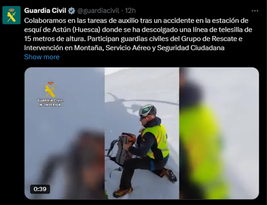 Azcón, también precisó que rescataron a todos los esquiadores que habían quedado “colgados” de la  aerosilla. Mientras tanto, la Guardia Civil española confirmó en su cuenta de X que se descolgó una línea “de 15 metros de altura”.