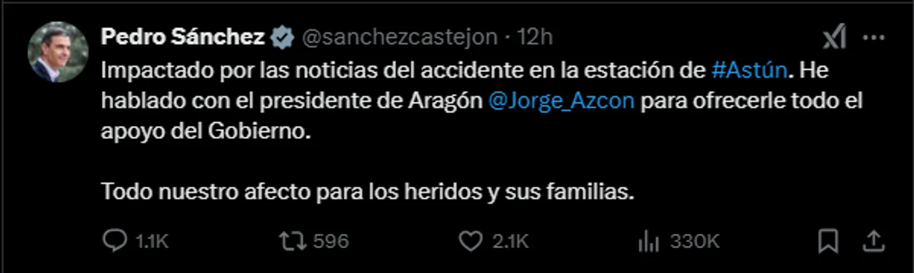 El presidente del Gobierno español, Pedro Sánchez dio un mensaje en su cuenta de X , y aseguró que se encontraba “impactado por las noticias del accidente en la estación de Astún”, quien indicó que habló con Azcón para “ofrecerle todo el apoyo” del Ejecutivo.