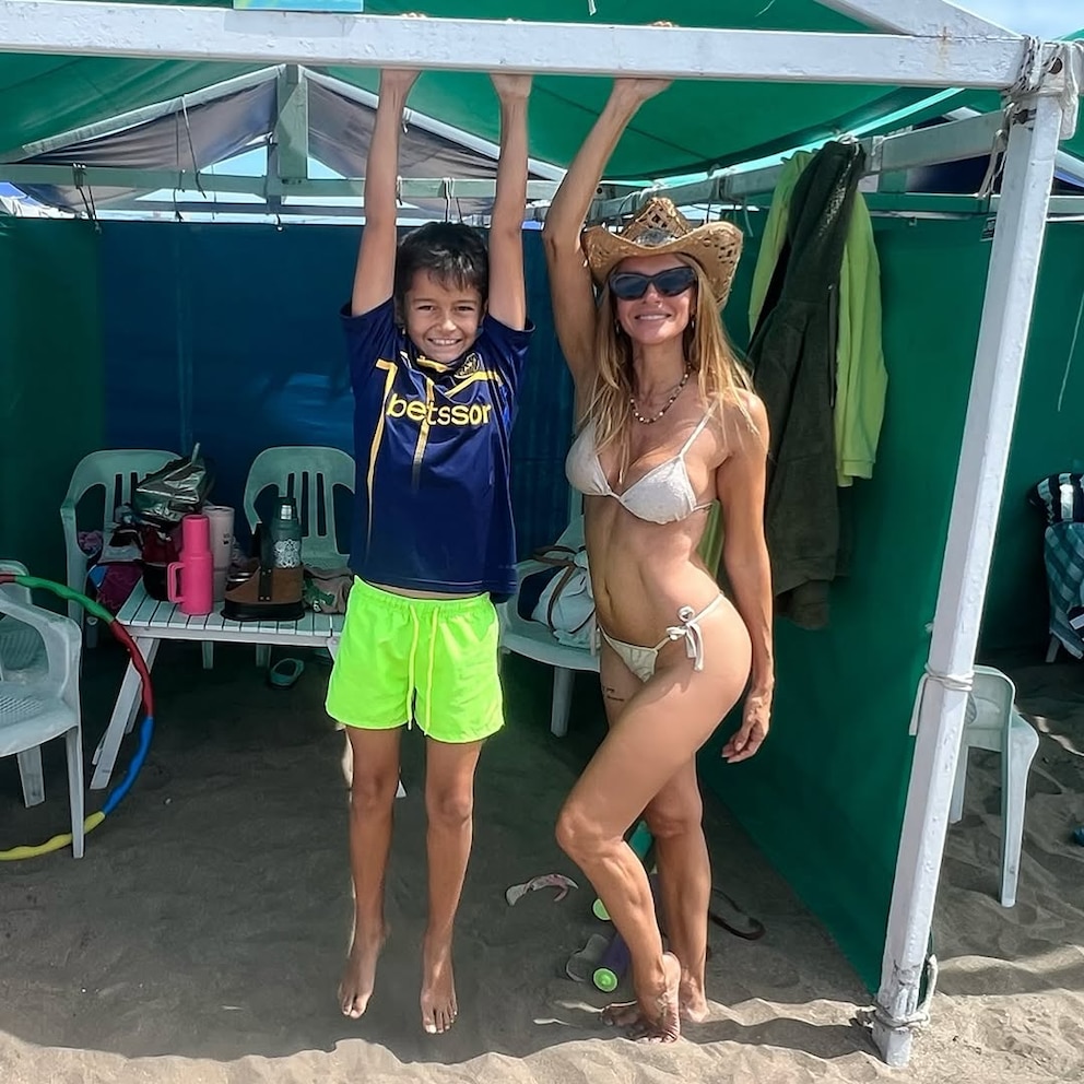 Otro momento destacado lo compartió junto a su hija Joaquina, quien lucía una colorida bikini y unas gafas rosas. La conexión madre e hija quedó reflejada en una postal tierna y espontánea. Por su parte, su hijo Benicio protagonizó una imagen divertida al colgarse de la estructura de una carpa mientras Vanina, en bikini blanca, posaba sonriente a su lado.