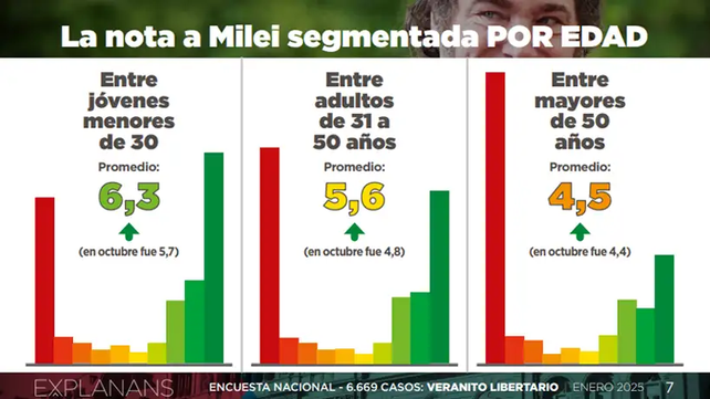 Al calificar el gobierno de Milei en una escala del 1 al 10, el promedio general es de 5,4. Sin embargo, esta calificación varía según la edad: los jóvenes menores de 30 años otorgan un promedio de 6,3, mientras que los mayores de 50 años le dan un 4,5. También existen diferencias por género, con los varones promediando 5,8 y las mujeres 5,1.