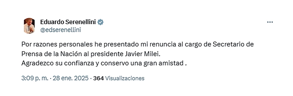 Eduardo Serenellini, reconocido periodista de televisión y radio, presentó este martes su renuncia como Secretario de Medios de la Nación, cargo que había asumido en diciembre de 2023 en reemplazo de Belén Stettler. Serenellini comunicó su decisión a través de sus redes sociales, donde expresó: “Por razones personales he presentado mi renuncia al cargo de Secretario de Prensa de la Nación al presidente Javier Milei. Agradezco su confianza y conservo una gran amistad”.
