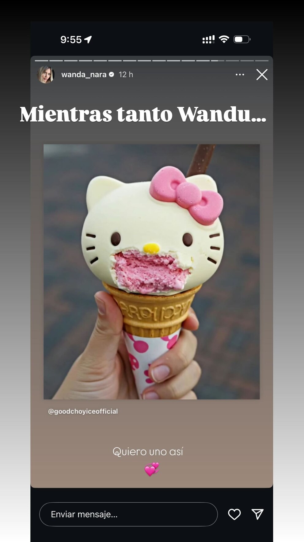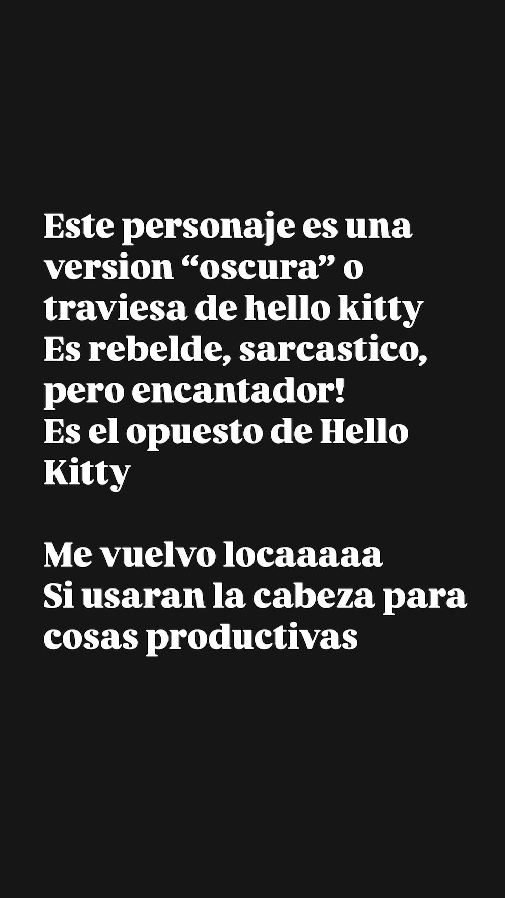 “Me puse a googlear de nuevo. Este es Kuromi... el personaje antagonista de Hello Kitty. La nipona no da puntada sin hilo. Este personaje es una versión ‘oscura’ o traviesa de Hello Kitty. ¡Es rebelde, sarcástico pero encantador! Es el opuesto de Hello Kitty”, describió. “Me vuelvo locaaa. Si usaran la cabeza para cosas productivas”, lanzó, picantísima. “Mientras tanto, Wandu...”, escribió, en otra de sus stories, junto a una foto de un helado de Kitty.