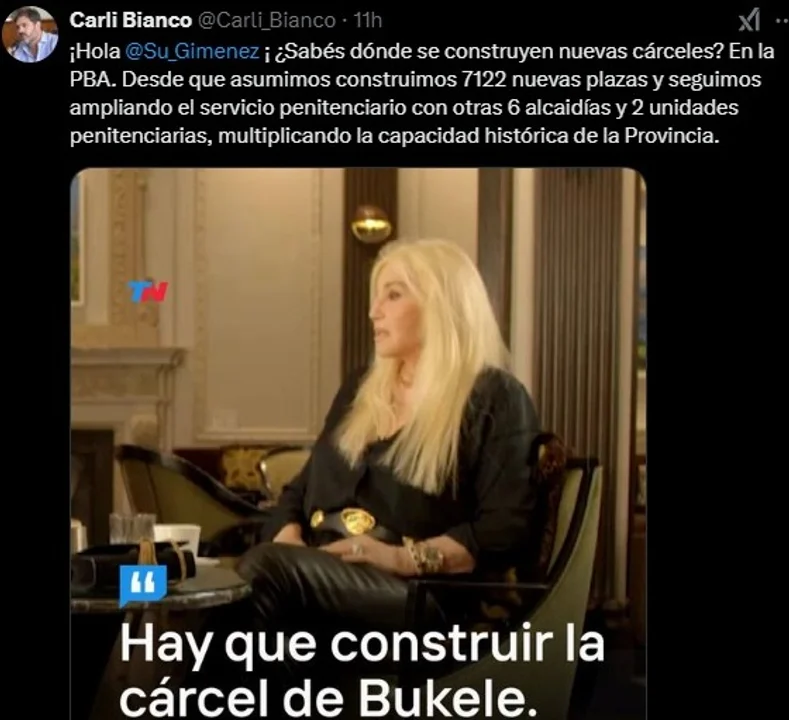 Desde el gobierno de Axel Kicillof, el ministro Carlos Bianco, le respondió a Susana Giménez, quien pidió que se construyan “cárceles como las de (Nayib)Bukele”, presidente de El Salvador: “¿Sabés dónde se construyen nuevas cárceles? En la Provincia de Buenos Aires”, expresó el funcionario en redes sociales.