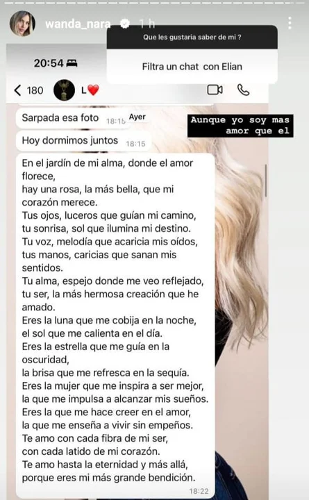 La conductora Wanda Nara compartió una captura de pantalla de un chat en diálogo con su novio Elías Valenzuela, más conocido como L-Gante, donde se puede observar un íntimo momento y el lado más romántico del intérprete que, en esa conversación afirmó: “Hoy dormimos juntos”.