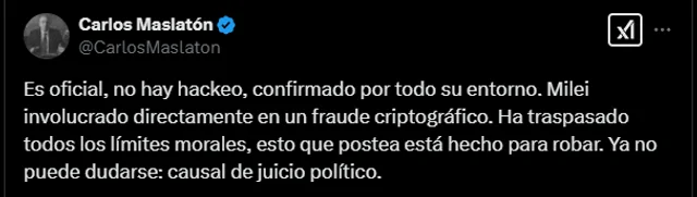 La publicación fue repudiada por el economista liberal Carlos Maslatón, quien denunció: “Es oficial, no hay hackeo, confirmado por todo su entorno. Milei involucrado directamente en un fraude criptográfico. Ha traspasado todos los límites morales; esto que postea está hecho para robar. Ya no puede dudarse: causal de juicio político”.