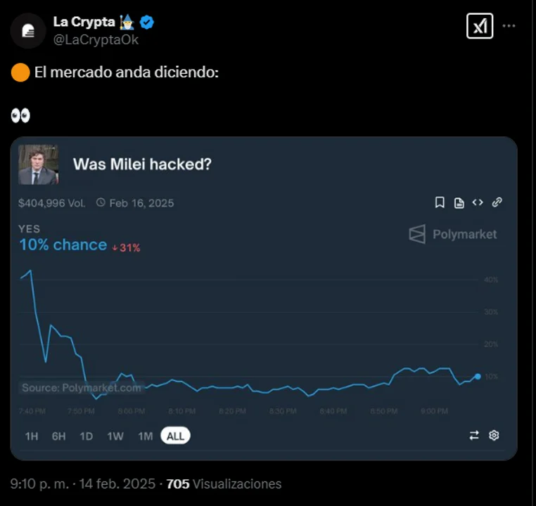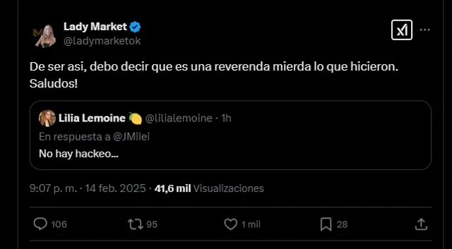 Ornella Panizza, la trader que es más conocida como «Lady Market», comentó: “Quiero creer que le hackearon la cuenta a Milei porque LIBRA fue un scam tremendo. Dos cuentas con el 70% del supply, raro. Tienen que dar explicaciones”.