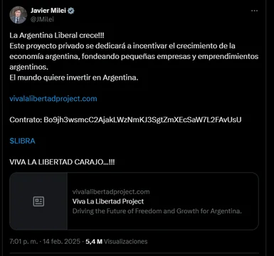 “¡La Argentina Liberal crece! Este proyecto privado se dedicará a incentivar el crecimiento de la economía argentina, fondeando pequeñas empresas y emprendimientos argentinos. El mundo quiere invertir en Argentina”, posteó Milei y remitió a la web https://vivalalibertadproject.com.