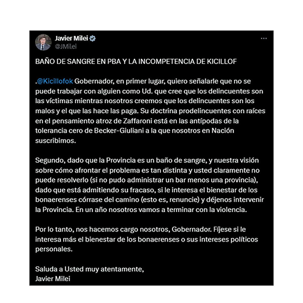 “Dado que la provincia es un baño de sangre, y nuestra visión sobre cómo afrontar el problema es tan distinta, y usted claramente no puede resolverlo (...), si le interesa el bienestar de los bonaerenses, córrase del camino (esto es, renuncie) y déjenos intervenir la provincia”, señaló Milei en su mensaje.