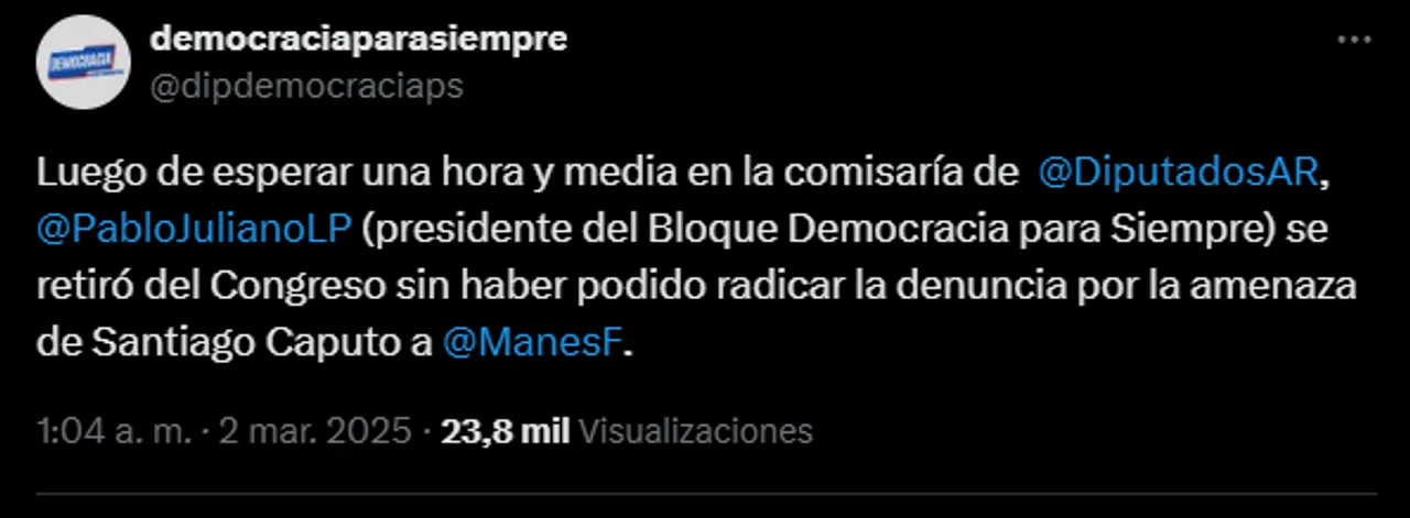 El bloque Democracia para Siempre intentó denunciar al asesor presidencial Santiago Caputo por violencia y amenazas contra Facundo Manes, pero al llegar a la comisaría de la Cámara de Diputados, no encontraron personal policial para recibir la denuncia.