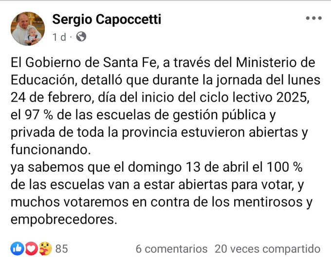Se trata del cura párroco de la Iglesia San Jerónimo de Coronda, presbítero Sergio Javier Capoccetti, quien en sus redes sociales habló del presupuesto docente en la Provincia de Santa Fe y sugirió que se vote en contra de los candidatos del Gobierno Provincial o puntualmente de Pullaro.