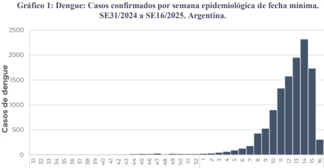 Según lo informado en el boletín epidemiológico N° 753/2025 de la Dirección de Epidemiología de Argentina, a nivel nacional en lo que va de la temporada 2024/2025 se notificaron desde la Semana Epidemiológica (SE) 31/2024 hasta la SE 16/2025 un total de 60795 casos sospechosos en el SNVS, de los cuales se confirmaron por laboratorio 6302 casos (6144 sin antecedente de viaje y 158 con antecedente de viaje a otros países Brasil, Cuba, México, Venezuela, Tailandia, India, Perú, Paraguay y Colombia) y por criterio clínico epidemiológico 5616 casos, lo cual hace un total de 11918 casos de dengue en el país. Además, se confirmaron 4 casos asociados a trasplante de órganos.