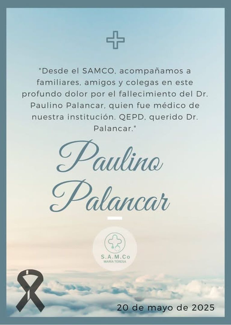 En tanto, el SIES 107 de Villa Cañás, el Samco San Gregorio y diversas instituciones del sistema de salud de la región sumaron su voz para despedir a quienes consideraban colegas y amigos. San Gregorio, localidad donde Palancar había ejercido como director del Samco, decretó duelo institucional y el centro de salud atenderá únicamente urgencias.