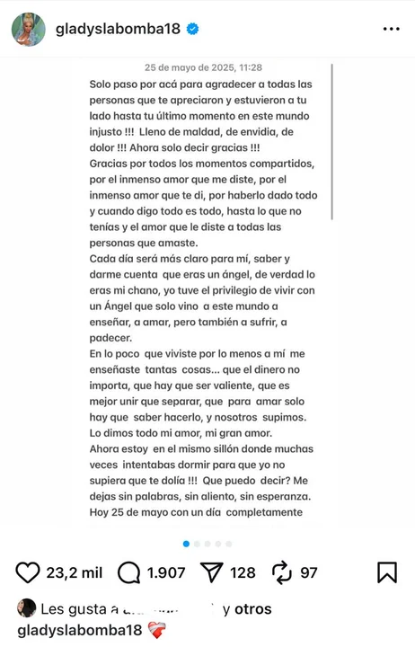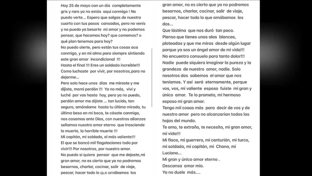 Gladys cerró su emotiva carta con un efusivo “te amo” al cielo: “Tengo mil cosas más para decir de vos y de nuestro amor pero no alcanzarian todas las hojas del mundo. ¡Te amo, te extraño, te necesito, mi gran amor, mi vida! Mi flaco, mi guerrero, mi centurión, mi turco, mi soldado, mi capitán, mi Chano, mi Luciano... Mi gran y único amor eterno. Descansa amor mío. Ya no duele más....”.