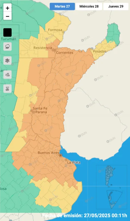 El Servicio Meteorológico Nacional (SMN) emitió una alerta naranja por tormentas fuertes para amplias zonas del centro y norte de la provincia de Santa Fe, vigente durante este martes 27 de mayo. El fenómeno también afecta a otras regiones del país, pero en Santa Fe se espera una de las mayores intensidades, con riesgos asociados al clima severo.