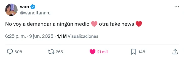Sin embargo, la empresaria utilizó sus redes sociales para aclarar los rumores que circularon durante el fin de semana: “No voy a demandar a ningún medio. Otra fake news”, escribió en su cuenta de X.