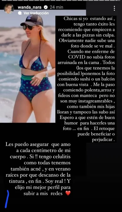 “Les puedo asegurar que amo a cada centímetro de mi cuerpo. Si!! Tengo celulitis como todas tenemos, también acné, y en verano raíces por que descanso de la tintura, en fin. Soy real! Y elijo mi mejor perfil para subir a mis redes”, cerró contundente.