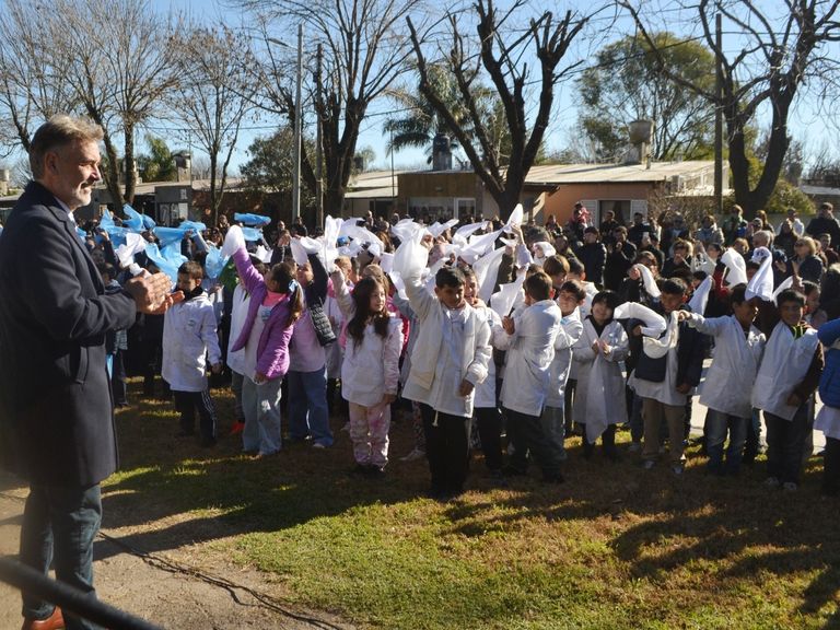Participaron niños y niñas de las escuelas Nº 159 “9 de Julio”, Nº 1285 “Roque Vassalli”, Nº 158 “Jacinto Fernández”, Nº 6377 “Evita”, Nº 157 “Domingo Sarmiento” y del Instituto “Virgen de la Merced”. El acto incluyó palabras alusivas a la figura del General Manuel Belgrano, creador de la enseña patria, resaltando su legado histórico y valores como el compromiso, la valentía y el amor a la Nación.