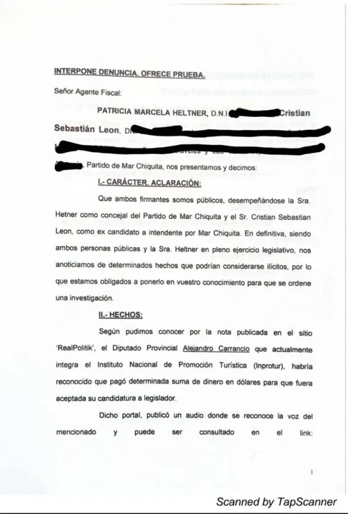 Dirigentes de Mar Chiquita presentaron audios y documentos en la Justicia que involucran a Sebastián Pareja y Alejandro Carrancio en la presunta venta de lugares en listas legislativas.
