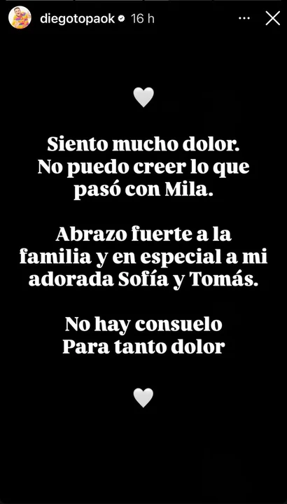 “Siento mucho dolor. No puedo creer lo que pasó con Mila. Abrazo fuerte a la familia y en especial a mi adorada Sofía y Tomás. No hay consuelo para tanto dolor”, escribió en sus redes sociales.