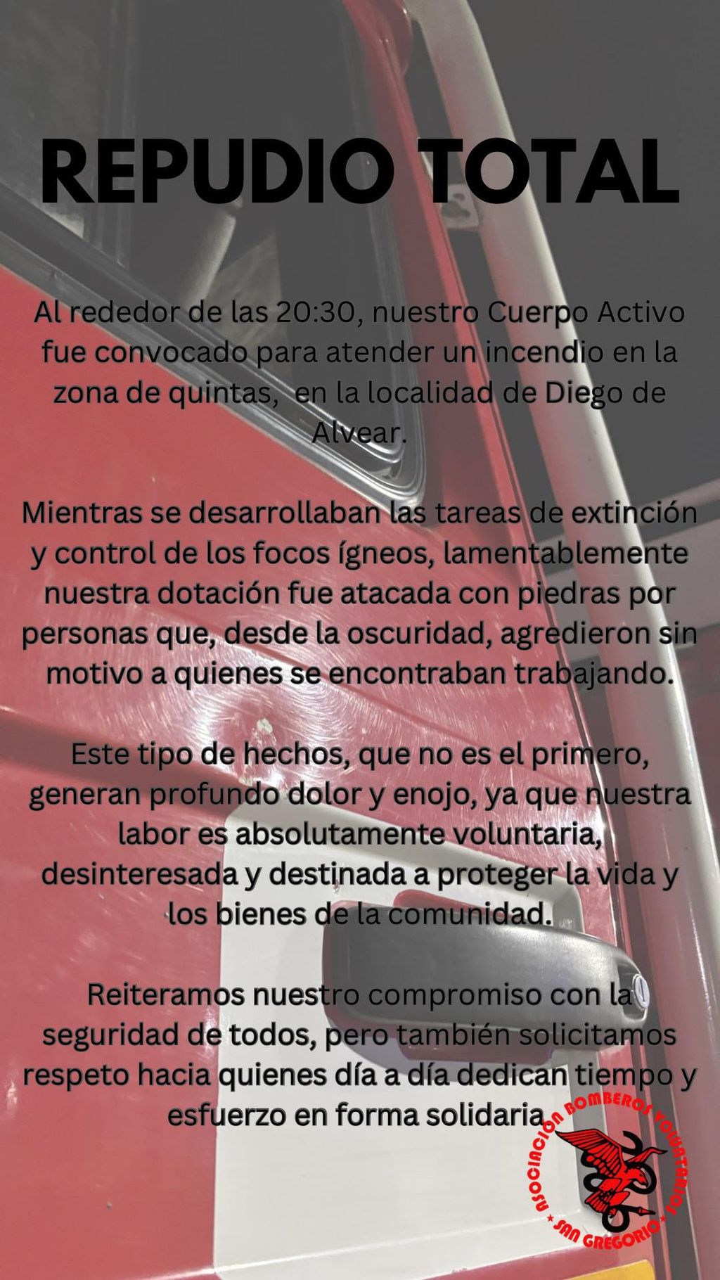 Los Bomberos Voluntarios de San Gregorio denunciaron haber sido víctimas de un ataque con piedras mientras trabajaban en un incendio forestal en la localidad de Diego de Alvear./https://sur24cdn.eleco.com.ar/media/2025/09/repudio_bomberos.jpg)