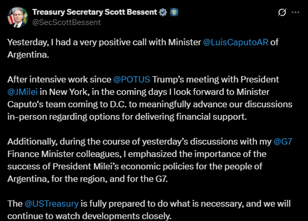 Scott Bessent confirmó que el Tesoro norteamericano está “preparado para hacer lo necesario” y anunció que un equipo de Economía viajará a Washington para avanzar en un posible apoyo financiero.