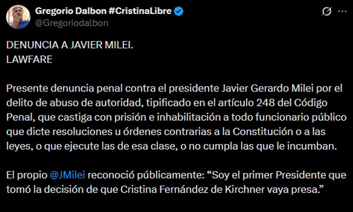 Gregorio Dalbón, uno de los abogados defensores de Cristina Fernández de Kirchner, presentó una denuncia penal contra el presidente Javier Milei por “abuso de autoridad”, tras las declaraciones del mandatario en las que afirmó haber “decidido que Cristina vaya presa”.