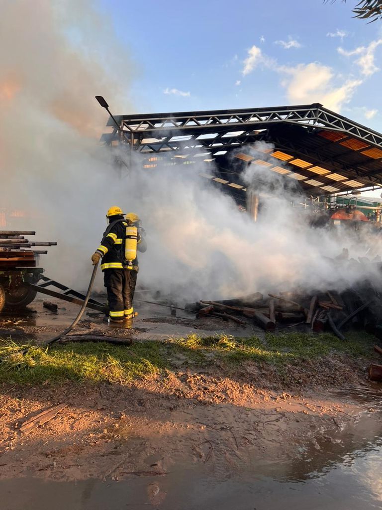 Treinta bomberos de tres localidades trabajaron para controlar un incendio que afectó una gran pila de leña usada para la caldera del frigorífico. El siniestro dejó un herido.