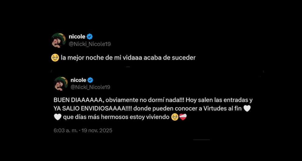 Una vez concluida la presentación, Nicki recurrió a sus redes sociales para compartir sus sensaciones. “La mejor noche de mi vida acaba de suceder”, escribió en X. Con el correr de las horas, siguió publicando videos y mensajes: “Chicos, ¡sigo sin creerlo!” y “No dormí nada”, expresó al amanecer, mientras anunciaba novedades sobre sus próximos shows y la nueva temporada de Envidiosa, la serie en la que participa.