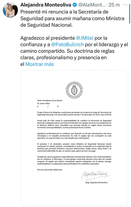 La funcionaria confirmó su llegada al cargo a través de un mensaje en redes sociales. “Presenté mi renuncia a la Secretaría de Seguridad para asumir mañana como Ministra de Seguridad Nacional. Agradezco al presidente Javier Milei por la confianza y a Bullrich por el liderazgo y el camino compartido”, expresó.
